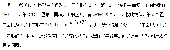 下列圖形都是由面積為1的正方形按一定的規(guī)律組成,其中,第(1)個圖形中面積為1的正方形有2個,第(2)個圖形中面積為1的正方形有5個,第(3)個圖形中面積為1的正方形有9個,…,按此規(guī)律.則第(6)個圖形中面積為1的正方形的個數(shù)為( )